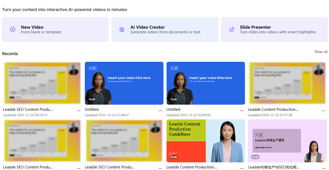 In practice, creating training videos has become both faster and more affordable than ever. With AI video platforms like Leadde, teams can turn documents or outlines into polished training videos in just a few minutes.