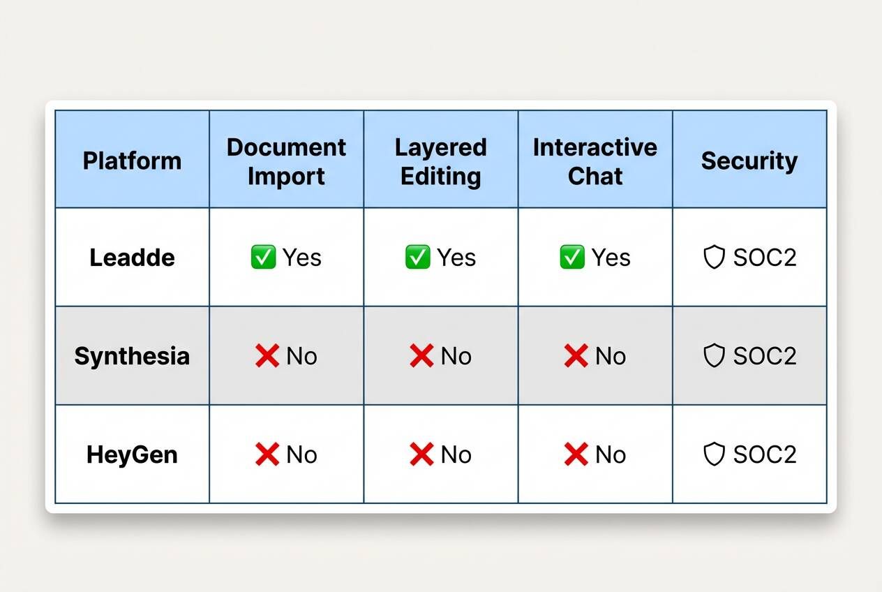 Leadde stands out by transforming business documents into professional videos instantly. It turns any text or file into high-quality video automatically. You create content in minutes rather than days, saving up to 80% of production costs.