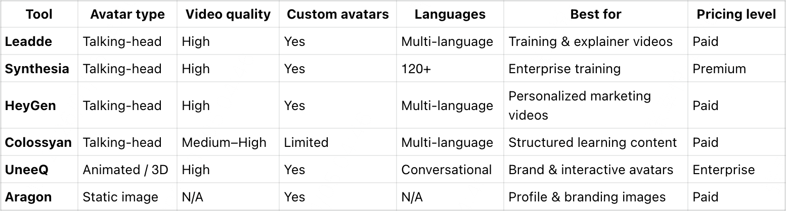The table below compares the most popular AI avatar tools for video creation across key decision factors, including avatar type, video quality, language support, and pricing level.