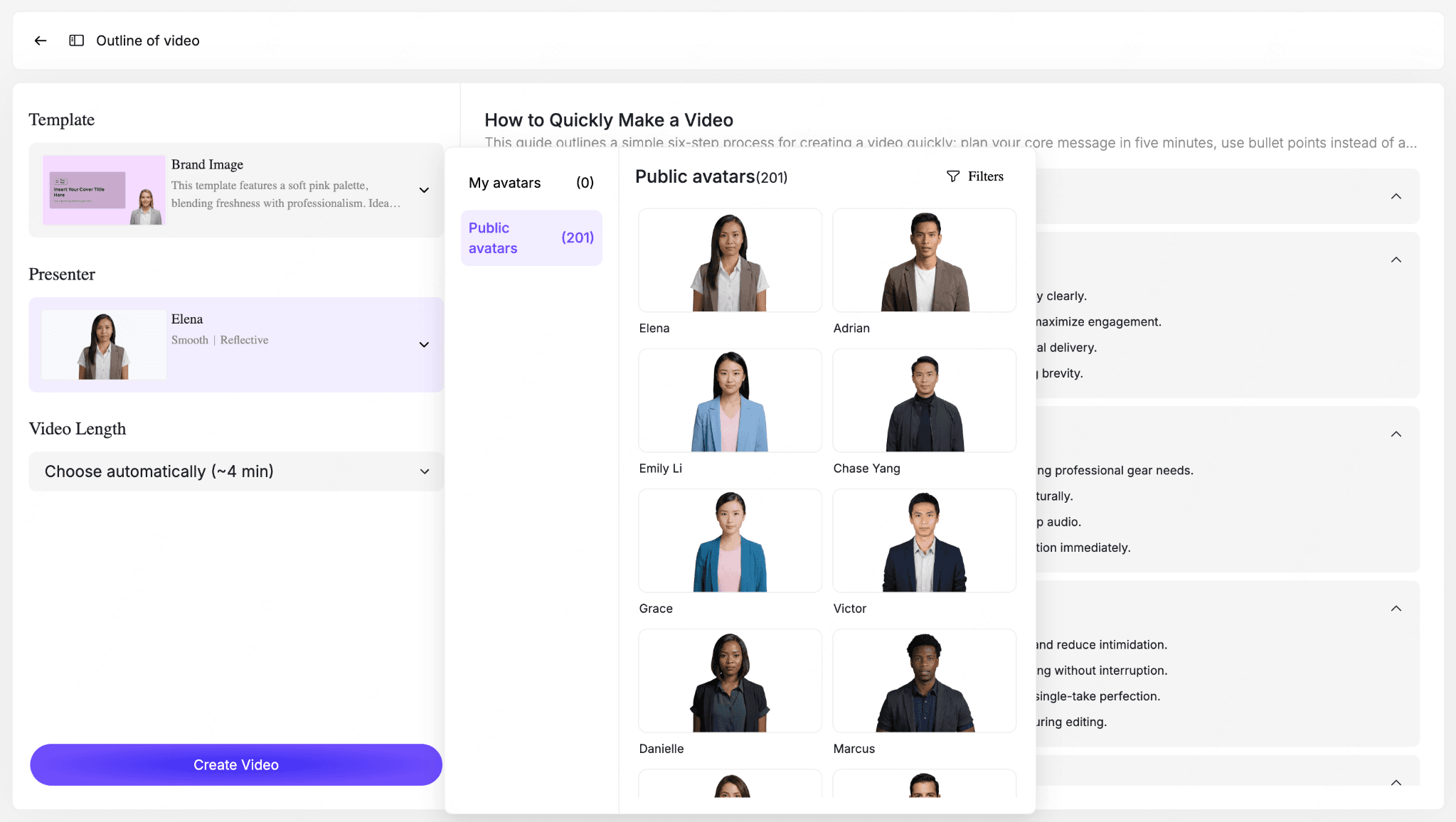 - Video generation workflow: Write a script → choose avatar and voice → generate video
