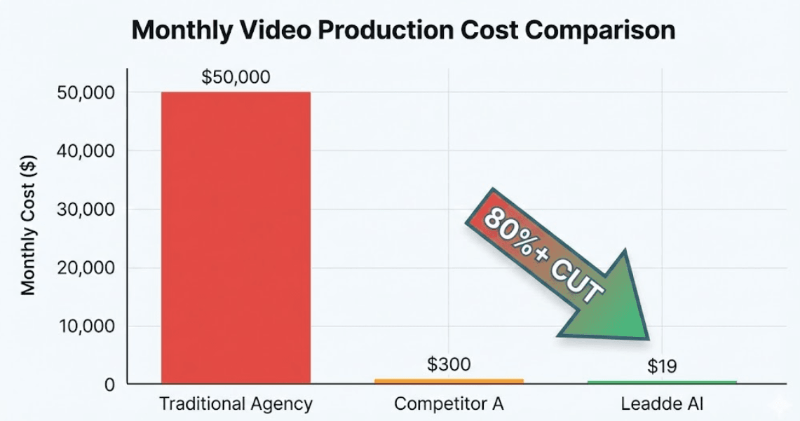 The Savings: Switching from an agency to Leadde saves 99.9%. Switching from a credit-based AI tool to Leadde saves roughly 90%. Even with a conservative estimate including internal staff time, Leadde easily secures the 80% total production cost reduction promised.
