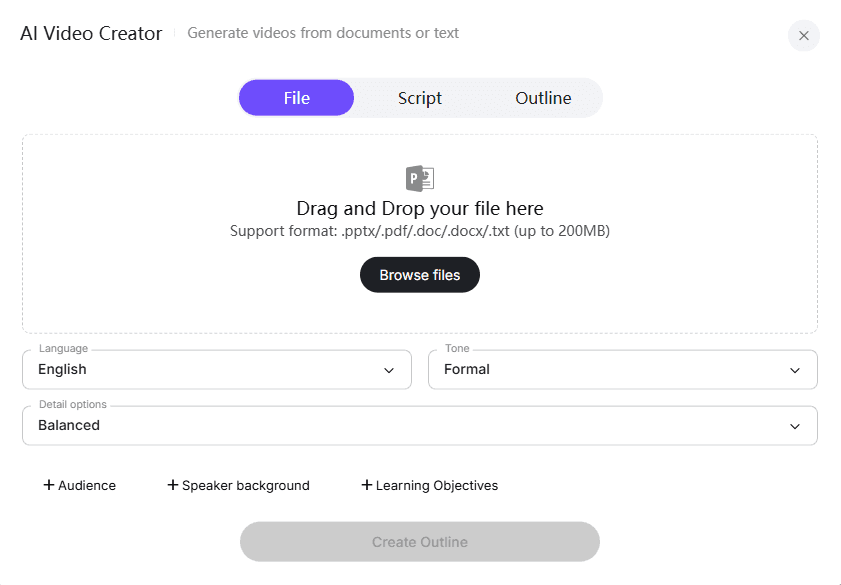 Upload your corporate script, outline, or media assets in DOC, PDF, PPT, or text format. AI platforms automatically analyze the structure, key points, and communication goals of your content. This ensures that your explainer video will cover all essential topics while maintaining a logical flow.