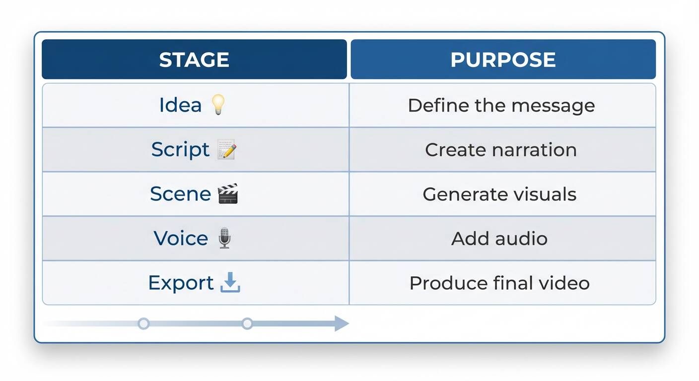 Many fast AI video workflows follow a simple production framework.