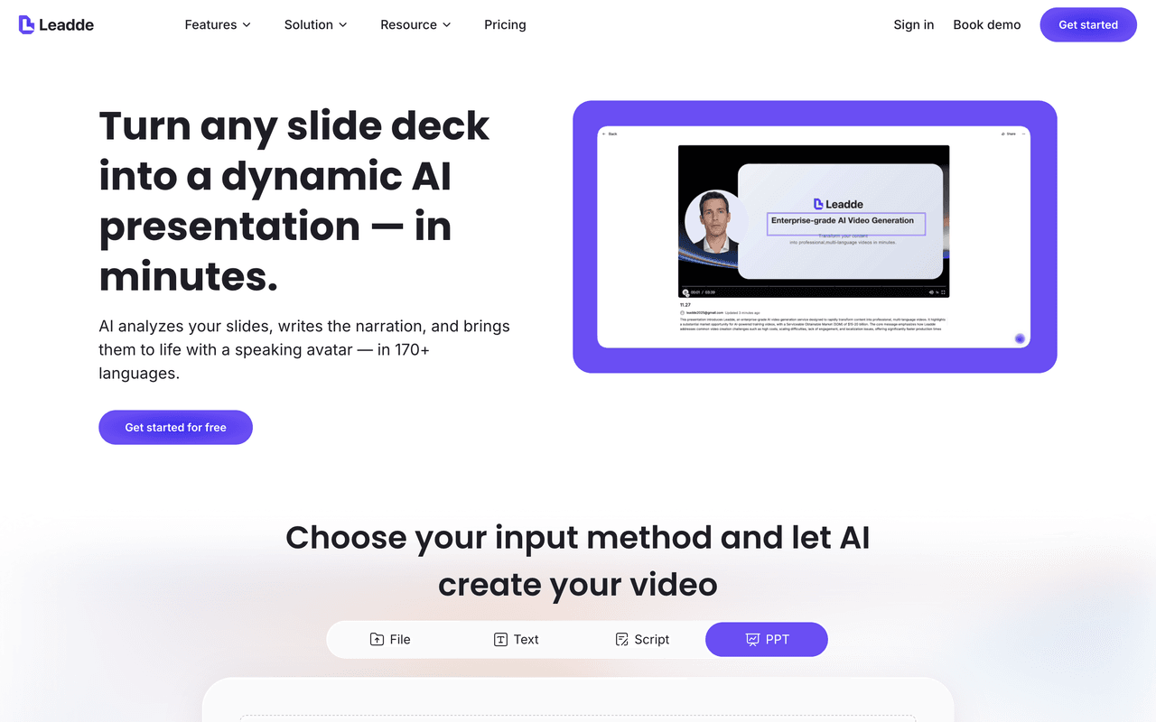 Traditional production begins with hours of tedious scriptwriting and manual outlining. Leadde allows you to skip this phase by repurposing your existing assets. This PPT to video conversion capability turns static files into structured narrations.