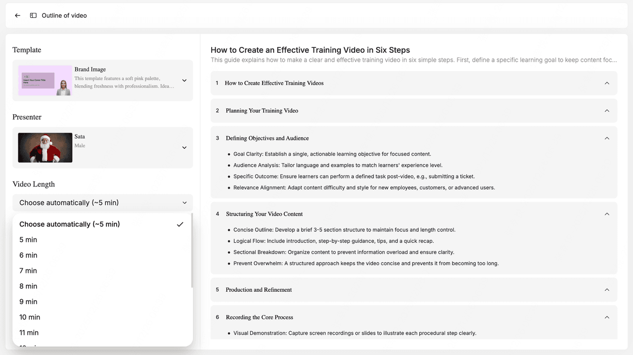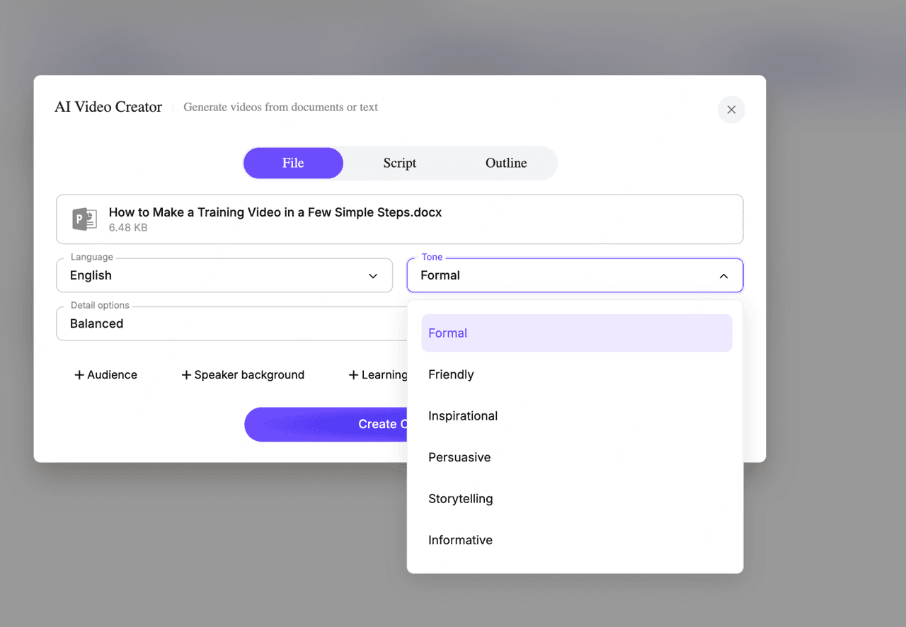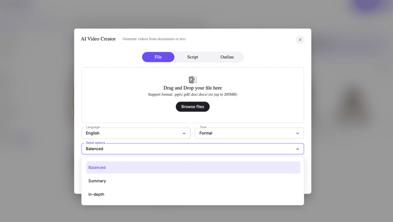 Choose how detailed you want the video content to be: balanced, summary, and in-depth. This option controls how deep the script goes—great for microlearning vs. in-depth training.