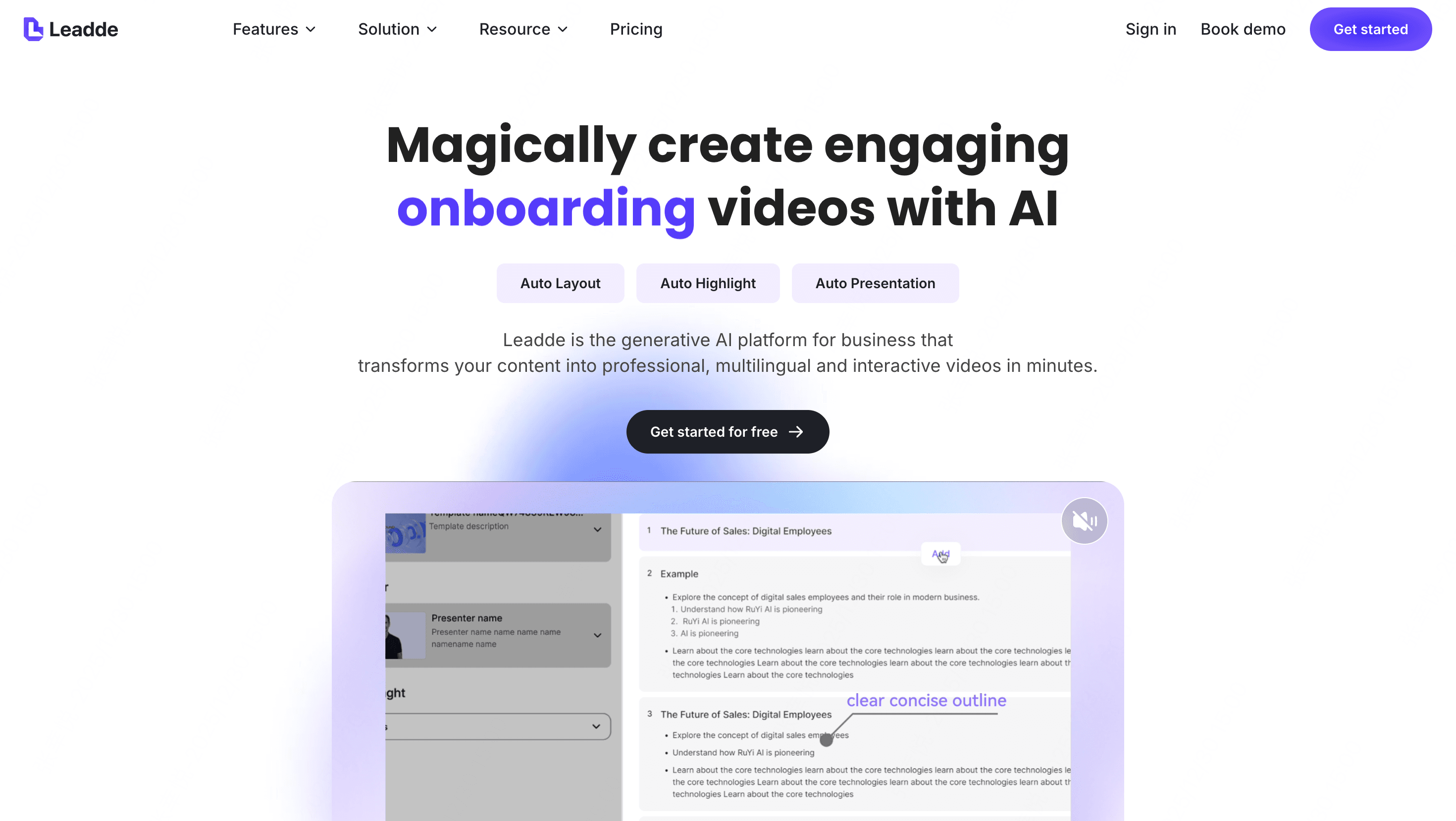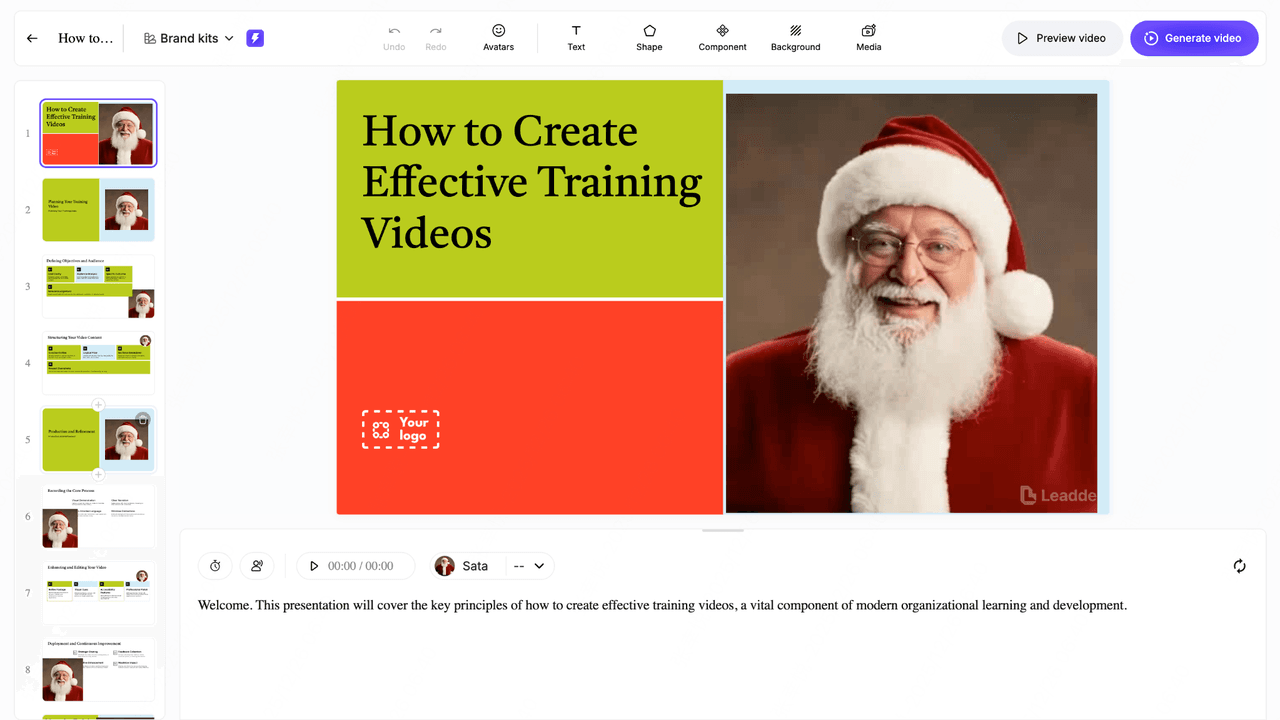 With an AI video generator like Leadde, you can turn existing scripts, documents, or slides into a professional training video in minutes. The platform automatically builds structured scenes, generates narration, highlights key points, and adds an AI presenter—making it easy to produce consistent, high-quality training videos at scale.