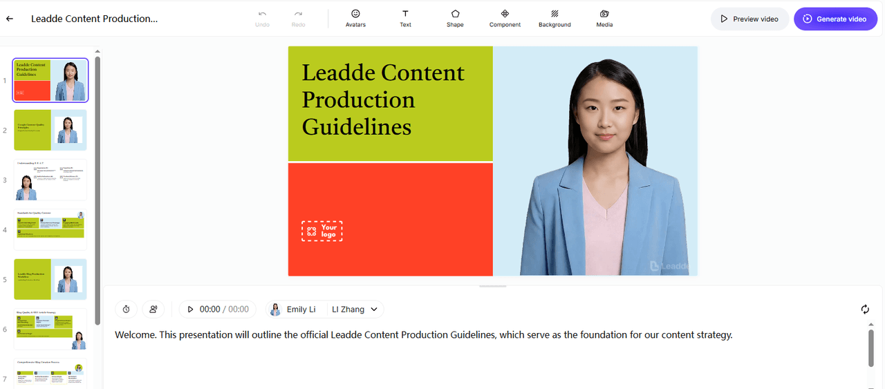 Leadde transforms the script into a complete tutorial video with structured scenes, smart highlights, and your chosen AI presenter. In just minutes, your video is ready to preview and share.