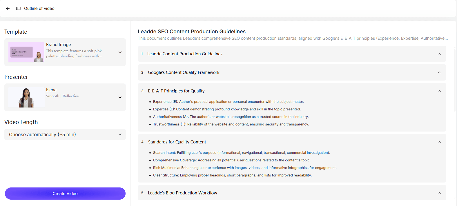 Click Create Video, and Leadde generates a clear, natural tutorial script based on your outline, language, tone, and presentation settings.