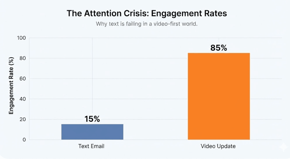 Video changes the cognitive load. A 2-minute video is processed 60,000 times faster than text by the brain. It adds tone, emotion, and urgency that a PDF attachment simply cannot convey, effectively becoming one of the most critical types of videos for modern business alignment.