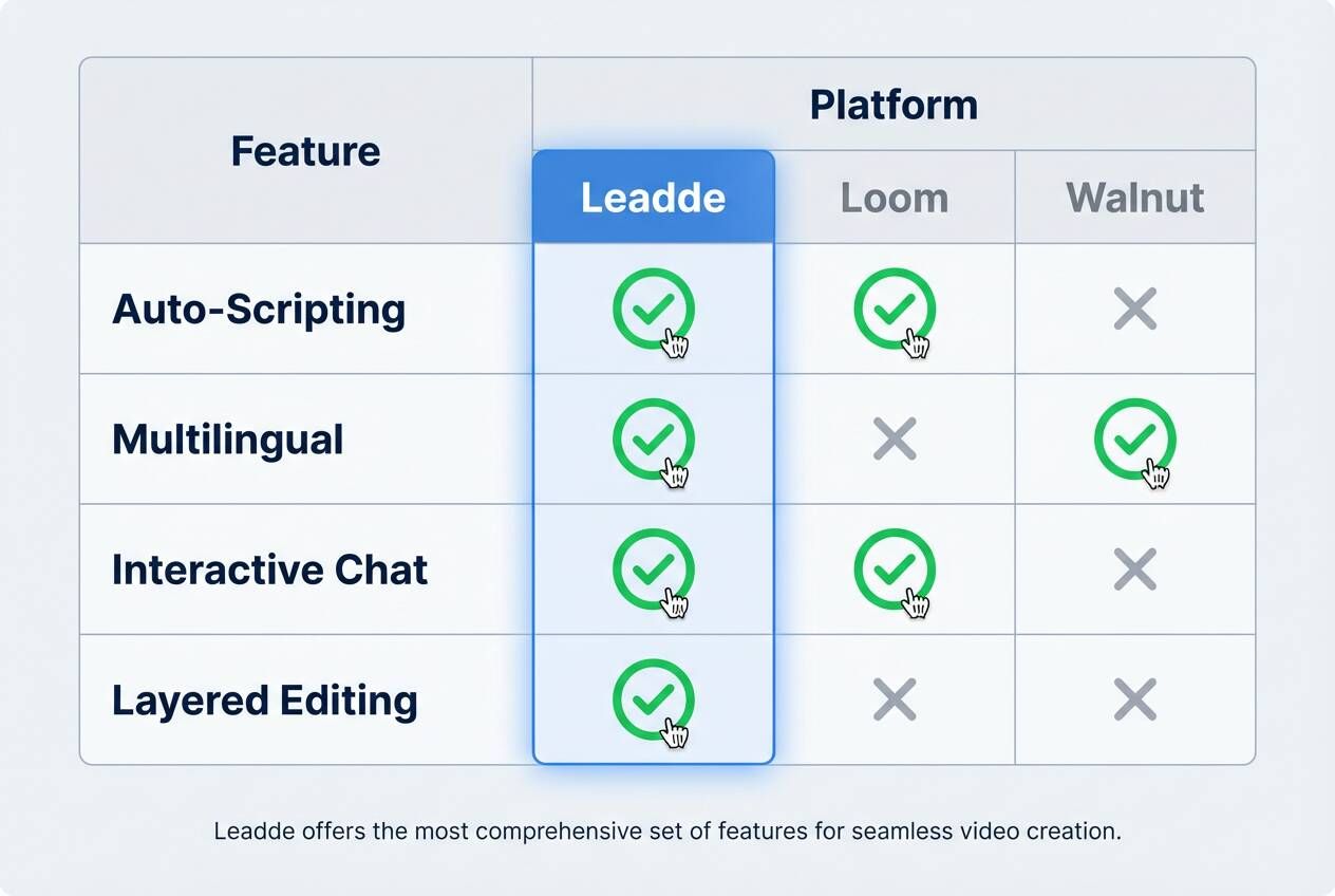 Leadde transforms this broken workflow entirely. By eliminating manual recording, it allows teams to scale production effortlessly.
