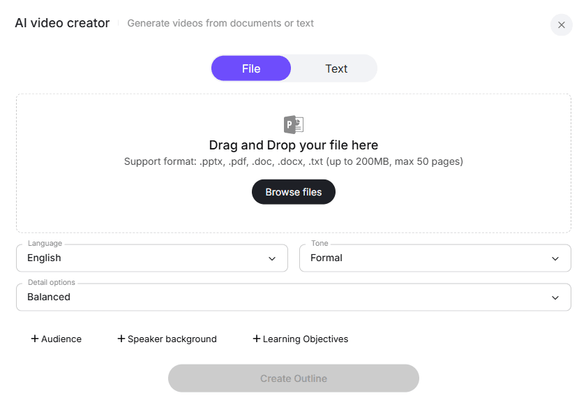 Start by importing your existing training material. You can drag and drop .pdf, .doc, or .pptx files directly into the platform. The system automatically analyzes the content to create a structured video outline.