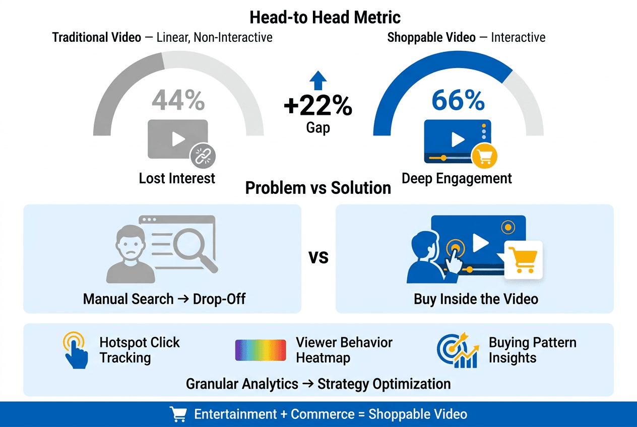 Interactive formats drive a 66% engagement rate compared to only 44% for linear, non-interactive videos. This deep interaction allows for granular analytics tracking, including hotspot click-throughs and viewer behavior.
