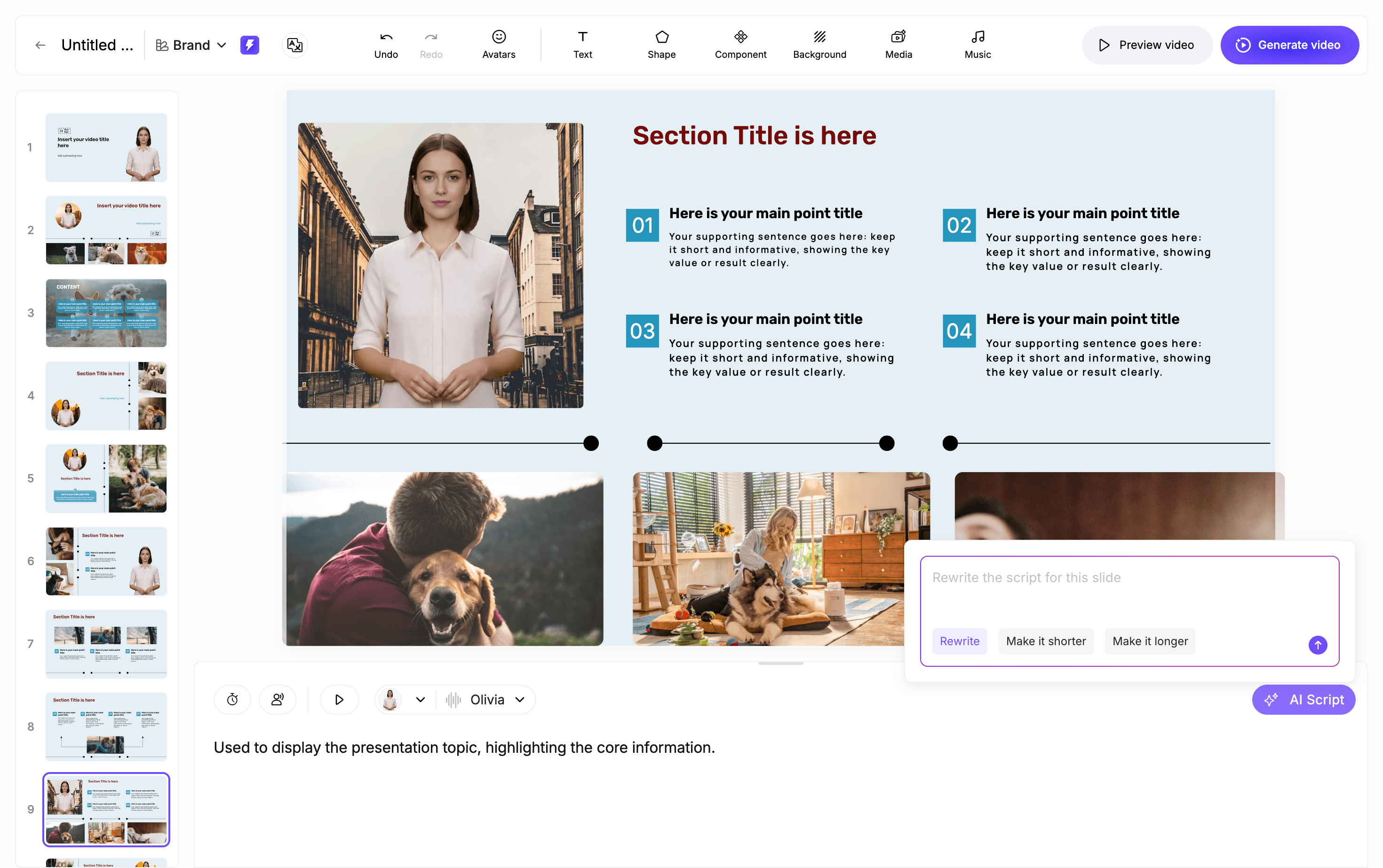 - Step 2: Select from 200+ lifelike AI presenters to act as a confident brand spokesperson for sensitive topics.