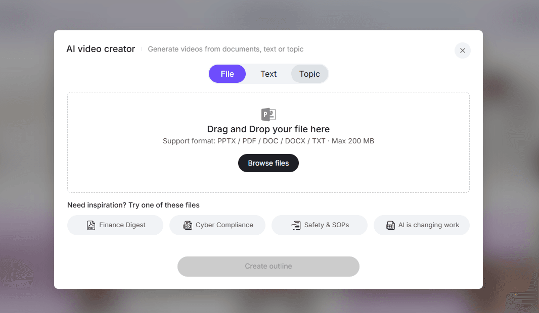 For example, users can upload files or paste text directly into the AI video creation interface to begin generating a training video.