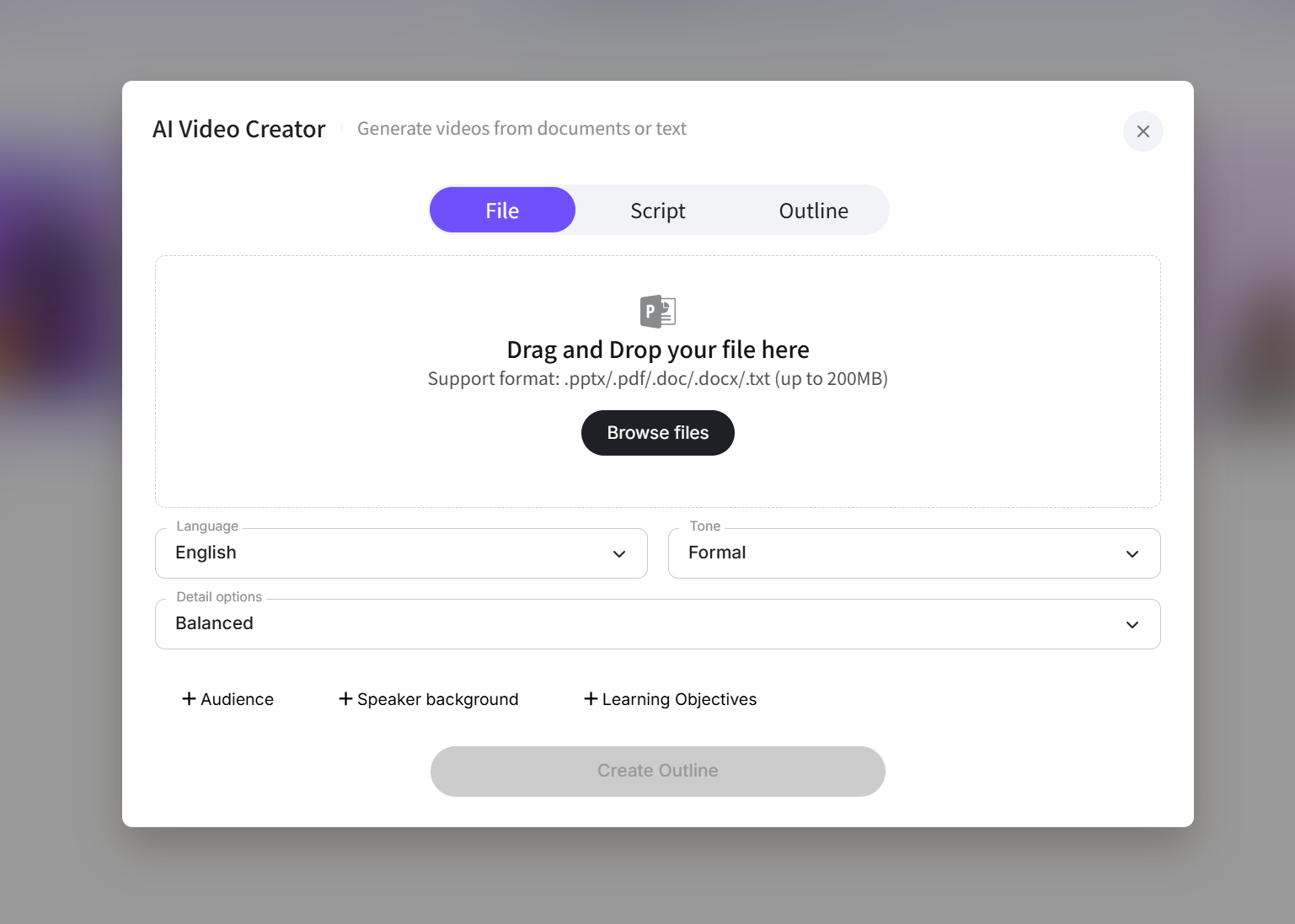 - Input Source Material: Upload your English PDF or PPT into the AI Video Creator.