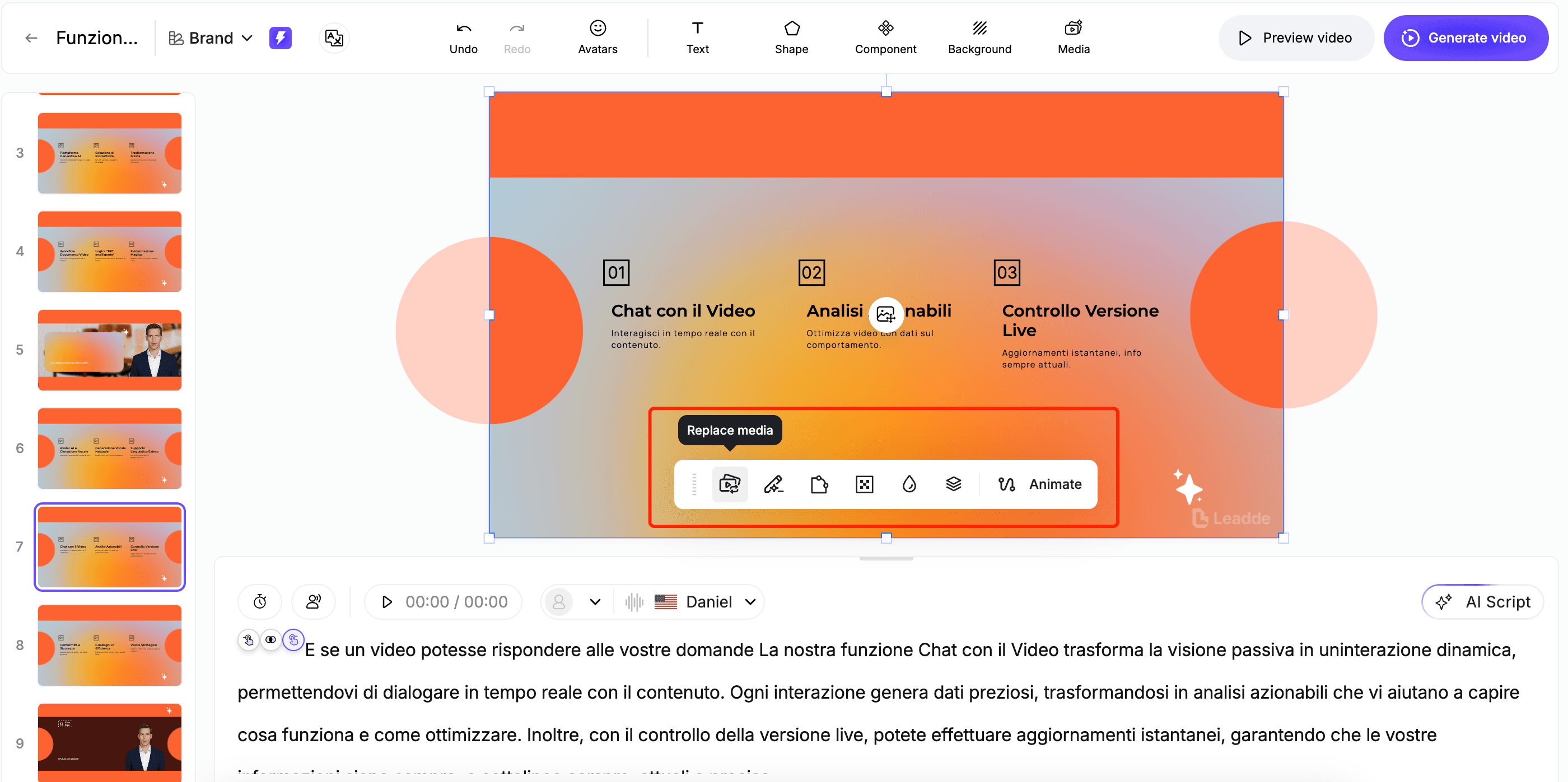 Many creators make the mistake of embedding text directly into the original video footage. This "baked-in" text is impossible to translate without performing a complete visual redesign. Leadde uses editable scene-level scripts to keep your text separate and easily manageable.
